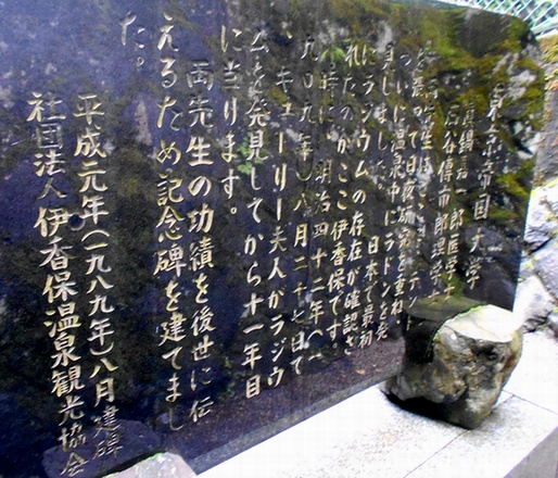 明治四十二年夏、東京帝大の真鍋嘉一郎医学博士と石谷傳市郎理学博士によりこの地で初めてラドン(ラジウムエマナチオン)が発見されました。(略)