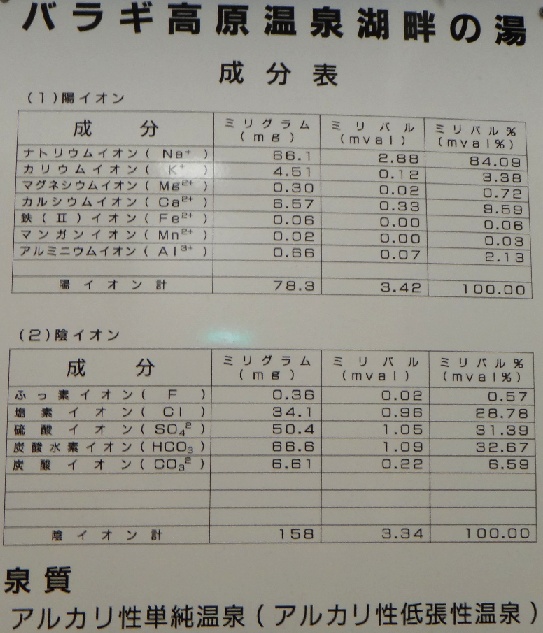 湧出量:62L 泉温:33.5℃ pH:8.8 成分総計:3.843g/kg