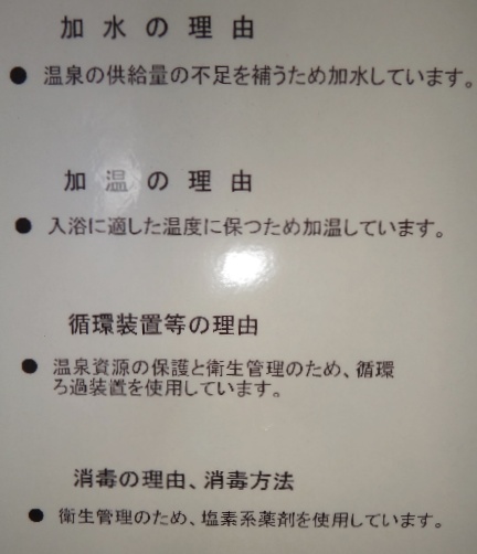 源泉名「かたくりの湯」、「供給量の不足を補うため午前中加水、加温、循環ろ過、塩素」。