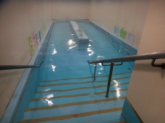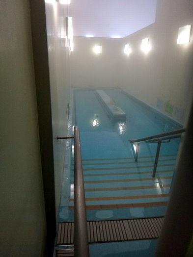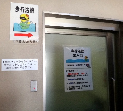 脱衣場で水着を着て、歩行浴の入口から歩行浴槽へ。