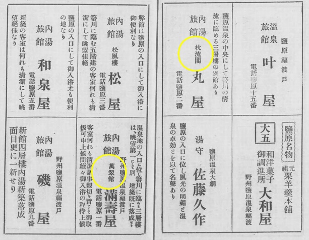 昔の「塩原案内全」の写真を見ると、丸屋と隣りの満寿屋は、今よりもっと箒川の近くに立地していました。